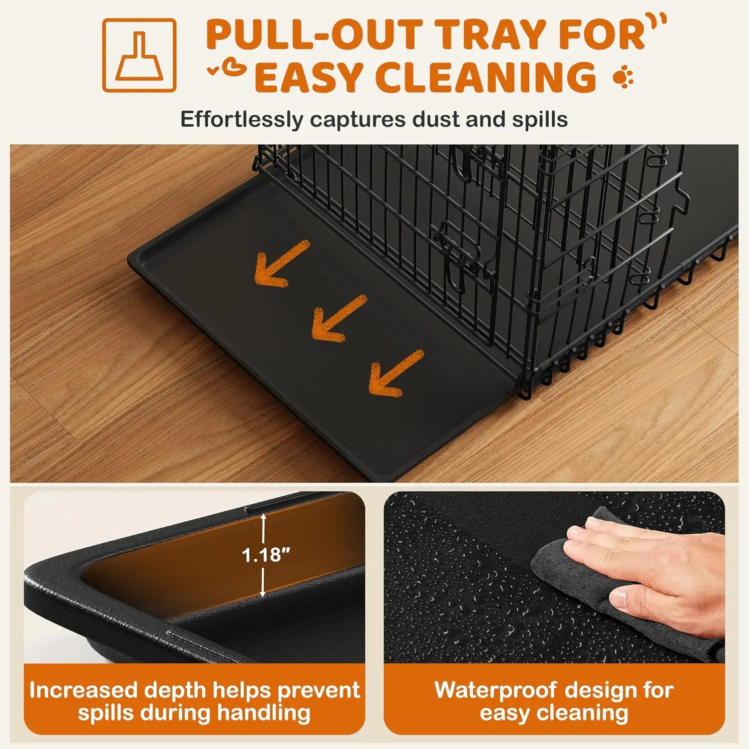 - Spacious interior suits medium-to-large breeds (Labradors, Golden Retrievers, Border Collies) and includes a pull-out leak-proof tray for simple cleaning.