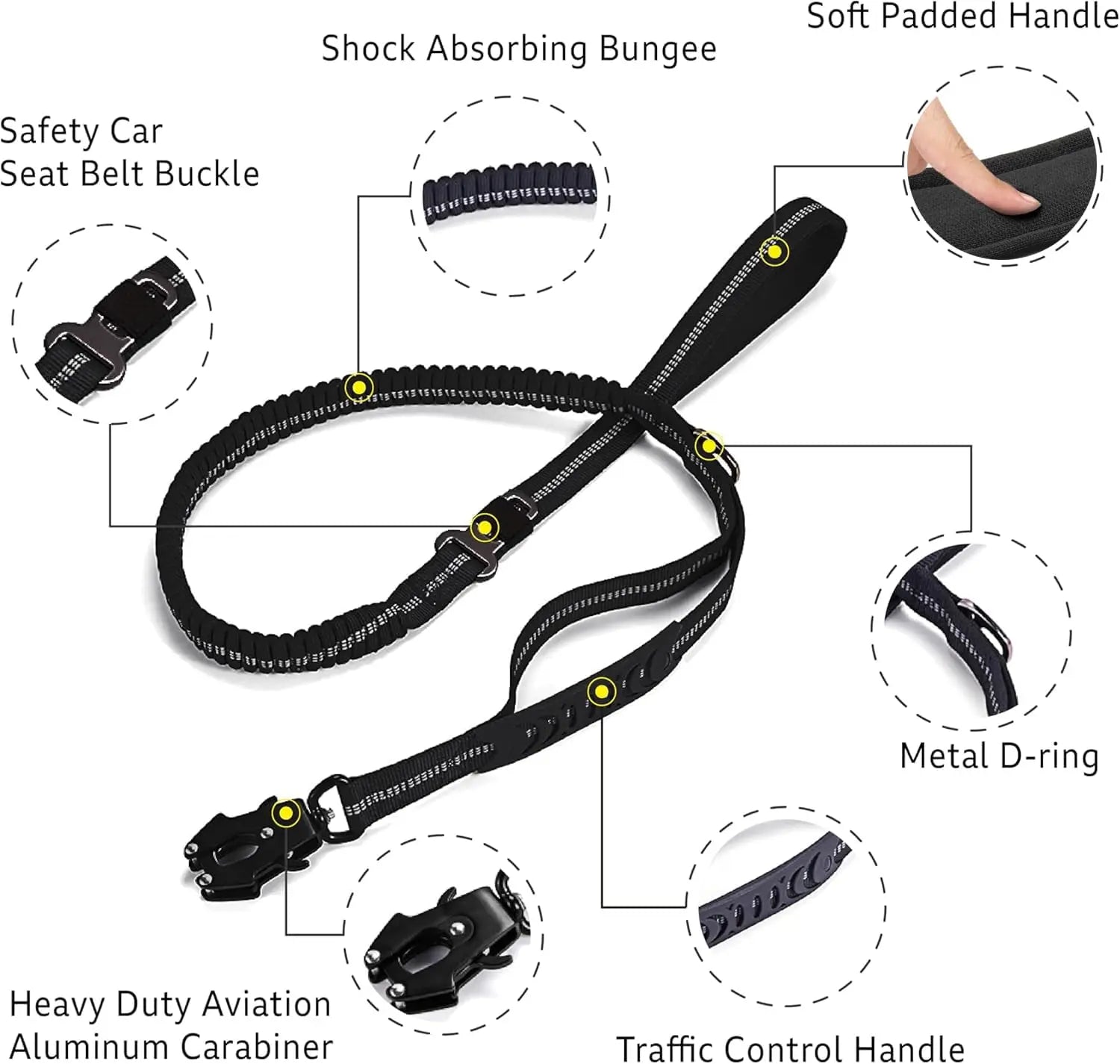 Reflective Shock Absorbing Tactical Dog Leash Car Seatbelt Heavy Duty